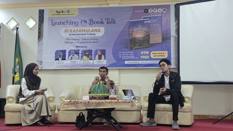 PALU-Dosen Universitas Alkhairaat Palu, Imaduddin Fadhlurahman meluncurkan novel berjudul Ri Kapamulana Untuk Kembali Pulang, di Aula Fakultas Agama Unisa Palu, Sabtu (24/5/2025) siang. Peluncuran novel yang diinisiasi Fakultas Sastra Unisa bekerjasama dengan penerbit Syab ini menghadirkan pembahas Dr. Ir, Nur Sangaji,dosen senior Universitas Tadulako Palu.