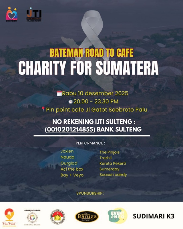 PALU-Ikatan Jurnalis Televisi Indonesia (IJTI) Pengda Sulawesi Tengah bersama Bateman Production menggagas sebuah kegiatan kemanusiaan bertajuk “Charity for Sumatera” sebagai bentuk kepedulian terhadap korban bencana di Sumatera Utara, Sumatera Barat, dan Aceh. Acara ini dijadwalkan berlangsung pada 10 Desember 2020, pukul 20.00 WITA di Pin Point Cafe, Palu.